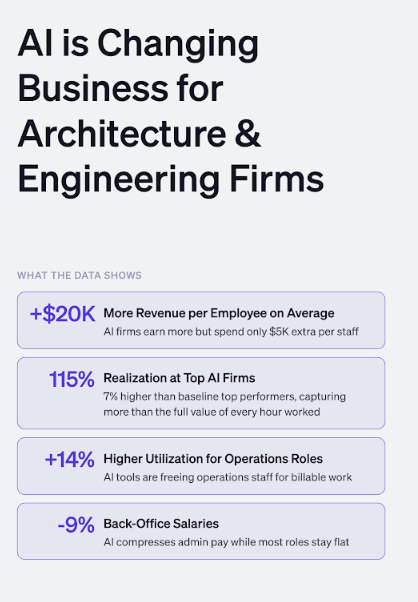 The Monograph 2026 benchmarks data shows the early performance gap is already measurable. Firms investing in AI today are generating $20K more per employee than baseline peers, running 14% higher utilization on operations staff, and compressing back-office costs by 11%. These gains are coming from relatively basic AI adoption applied to the financial and operational management side of the business, not from AI doing design or engineering work.