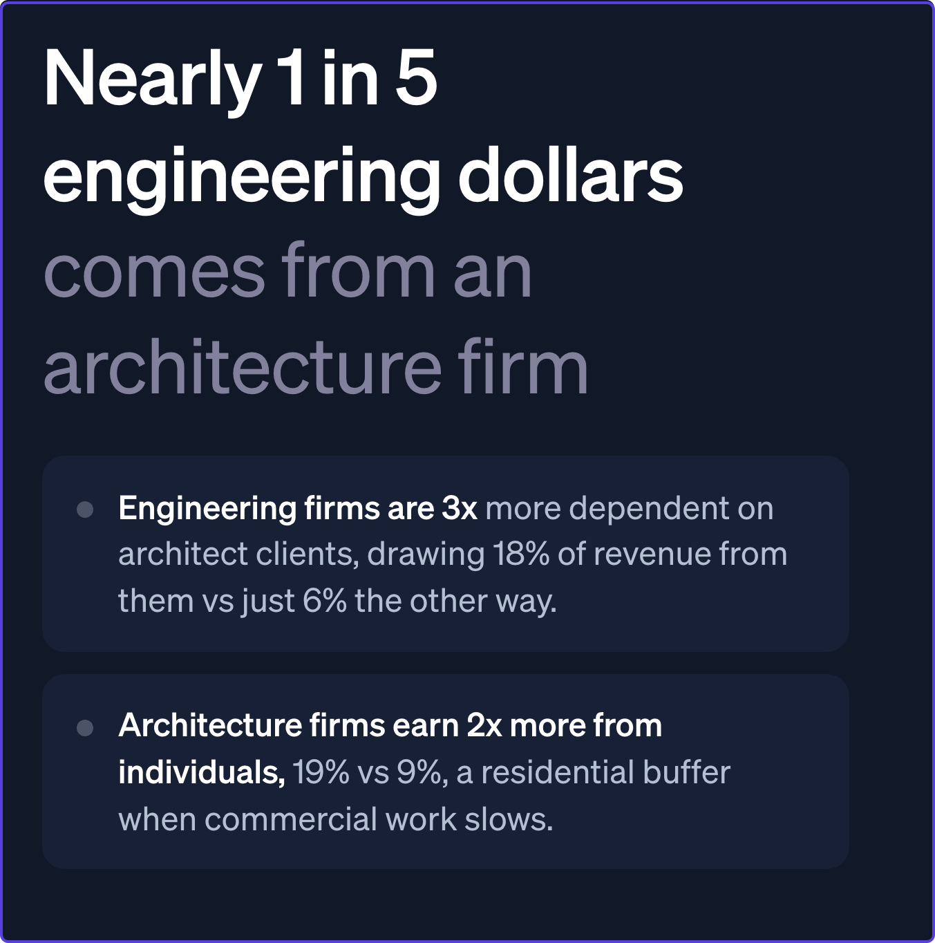 Architecture firms are engineering firms' most concentrated single client category outside of general business clients. And unlike diversified business clients, architecture firms are themselves highly sensitive to construction market cycles, interest rates, and project financing conditions. When architecture firms slow down, they issue fewer consultant contracts. Engineering firms that are heavily dependent on that referral pipeline feel it fast, and they often feel it before they see it coming in their own numbers.