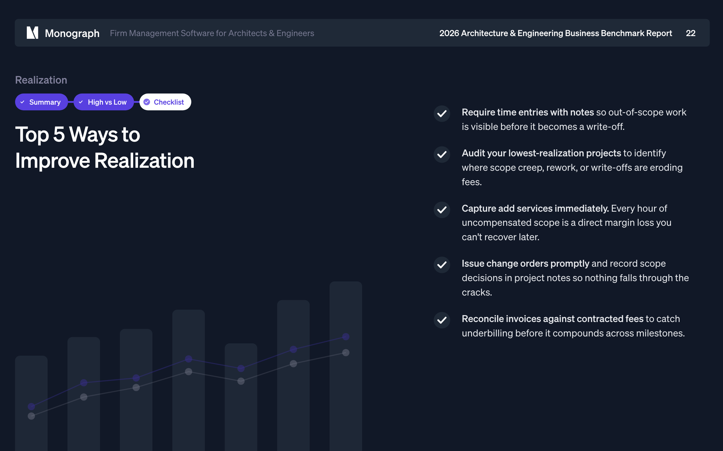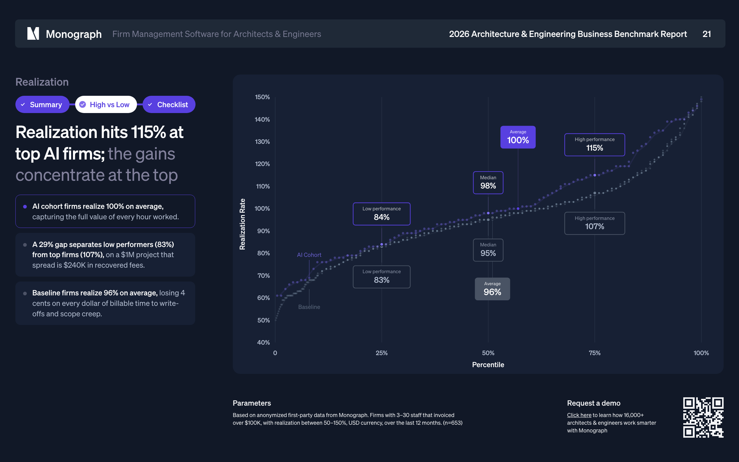 It's worth noting that the figures shared here and in the 2026 Architecture & Engineering Business Benchmarks report are based on accurate, first-party data from Monograph users. Notably, the Realization Rates for firms that use Monograph are higher than what is generally recommended. Why is that?
